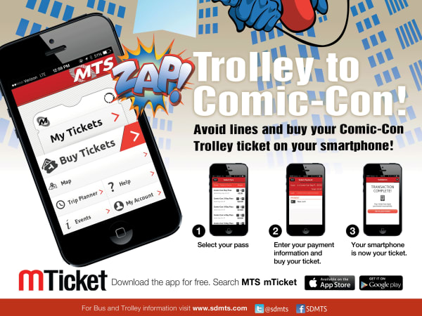 To help San Diego Comic-Con passengers avoid long Trolley ticket lines and provide a convenient ticket purchasing option, MTS introduced mTicket – a mobile ticketing app that puts the Trolley ticket vending machine in the pocket of the passenger.