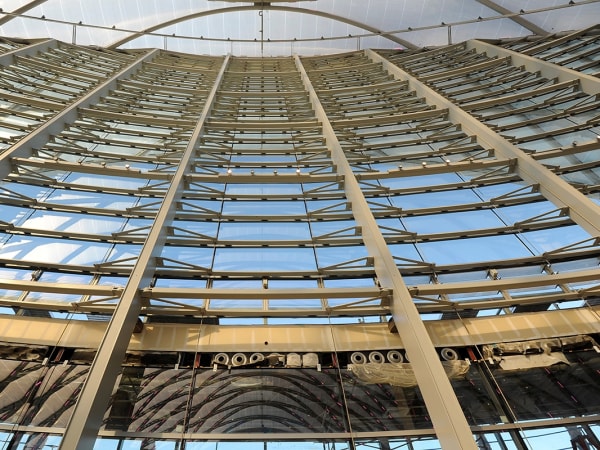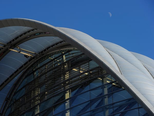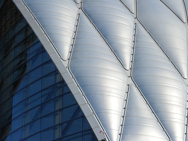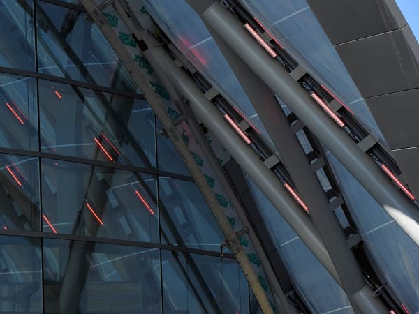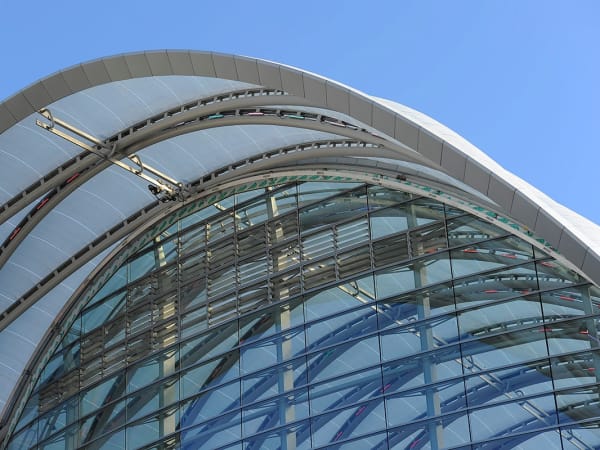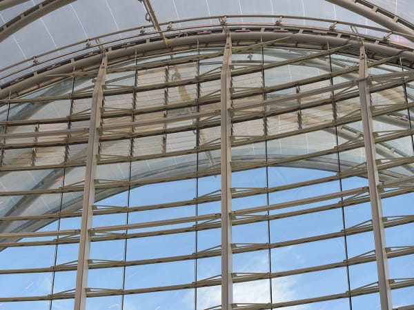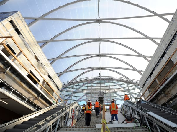 ARTIC's compound curved terminal shell features a 200,000 square-foot ethylene tetrafluoroethylene (ETFE) roof system stretched across a diamond-shaped metal grid (diagrid) that is supported by a structural steel frame.