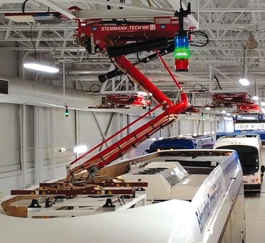 For the fastest overnight DC charging, the DepotPANTO features easy connection to roof-mounted rails and fully automatic loading. Lightweight ceiling mount design increases depot charging throughput and efficiency with automatic operation to minimize labor costs.