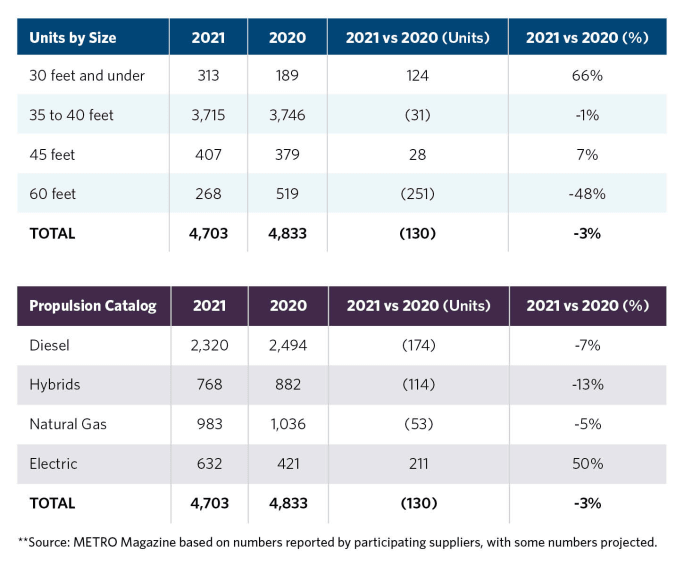 • Trolley and fuel-cell electric propulsion showed no units in 2021 which was consistent with 2020.