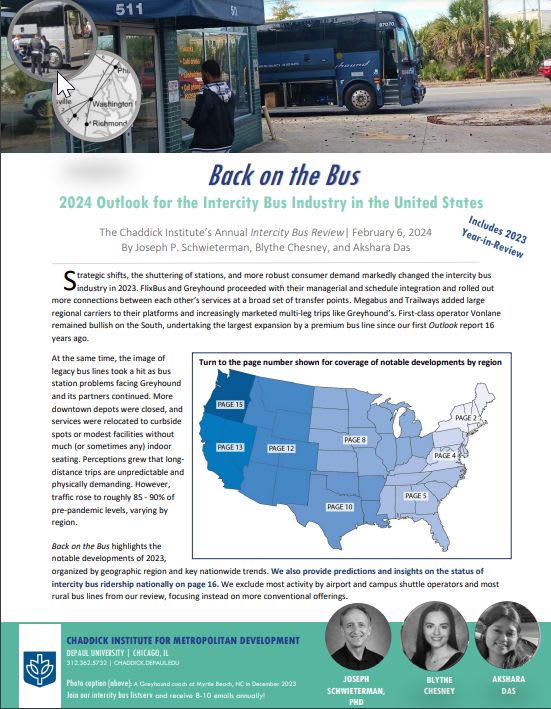 Joseph P. Schwieterman, Ph.D., is professor and director at the Chaddick Institute at DePaul University in Chicago. To access the report (PDF), click here. To receive his quarterly Intercity Bus E-News (free) or to reach the study team, contact chaddick@depaul.edu