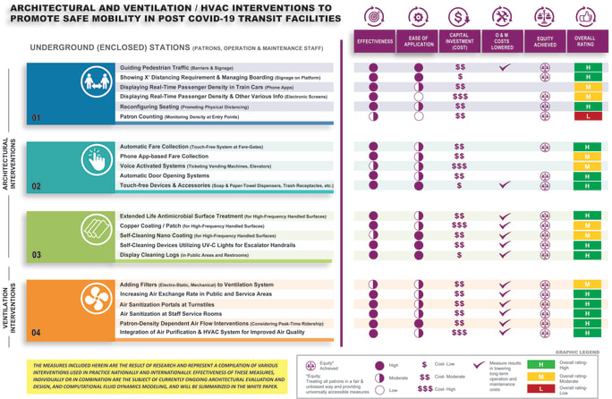 Evaluation matrices have been developed for stations, railcars, buses, and employee facilities, to assist transit facility owners and operators in evaluating their facility and vehicles in terms of their pandemic or post-pandemic resiliency, for both passengers and employees. The various types of architectural and ventilation intervention measures were evaluated for the following criteria: