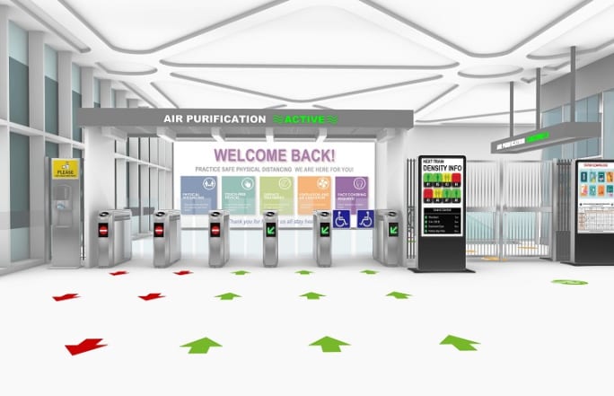 Air sanitization interventions, outlined above, should be located strategically within stations, so that their protective capabilities are accessible to the maximum number of riders. Such appurtenances, in form of portals at faregates, stairs, and/or escalators, and ventilation ducts and associated electrical and mechanical equipment require proper architectural treatment that enhances the station’s aesthetics, maximizes their efficiency, and provides clear messaging and reassurance of active air treatment measures being implemented.