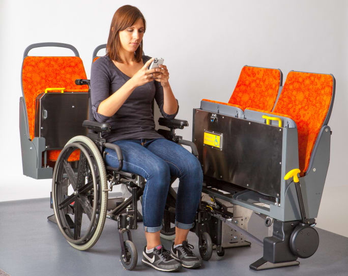 “The agency had a huge part in developing the flip-up, because they really had a need,” Wolf explains. “Some agencies were actually taking seats out of the buses so passengers could have a place to stow their strollers and carts, which meant there were two to four less seats on their buses.”