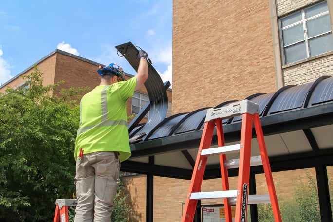 UW-Madison’s Transportation Services contracted with Urban Solar to add curved solar panels on barrel roofs on campus bus shelters.