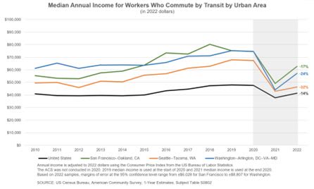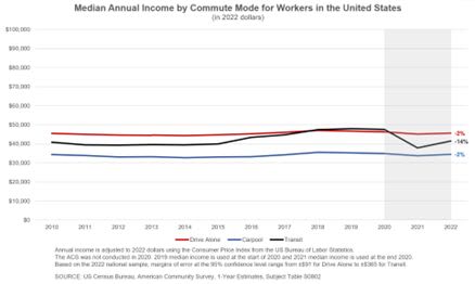 Newly released data from the 2022 American Community Survey indicates that the median income of US workers who commute by public transportation is still substantially below the pre-COVID median.