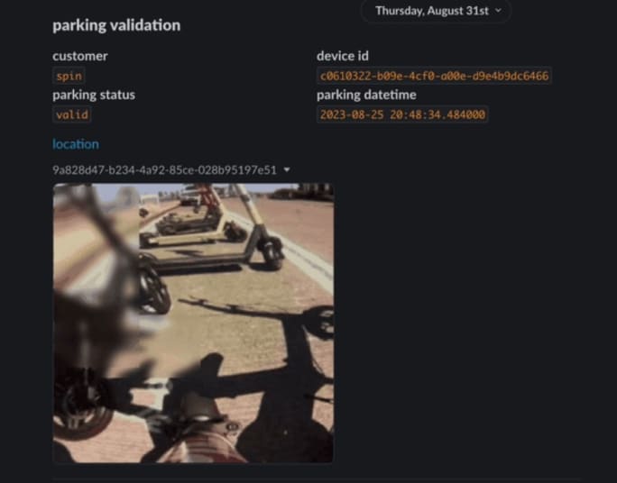 Parking 2.0 uses a short sequence of images (rather than the previous single image) and AI validation algorithms to rate each end of ride outcome and allow operators to take any necessary action. The GIF and accompanying AI score on the parking job provide detailed context on the end of ride previously unavailable from a single photo, whether taken by the rider or the vehicle. This new validation process is surfaced to operators and other customers in compliance with the latest MDS 2.0 standards via API and is also available via automated Slack alerts.