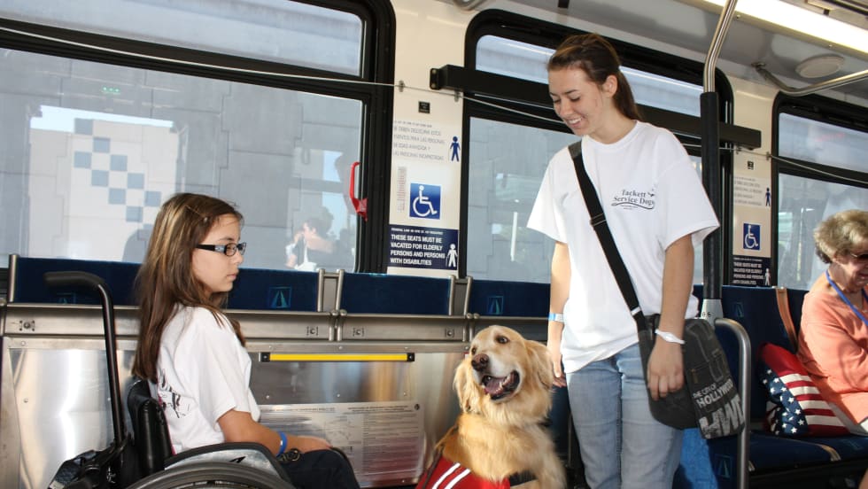 For more than 15 years, OCTA has organized an annual training day for service animals and their handlers, allowing them the chance to ride the bus in a controlled environment. This year’s training took place on a recent Saturday at a nearby theme park and provided an opportunity for the animals to become acclimated to situations that are often crowded, loud and unfamiliar.