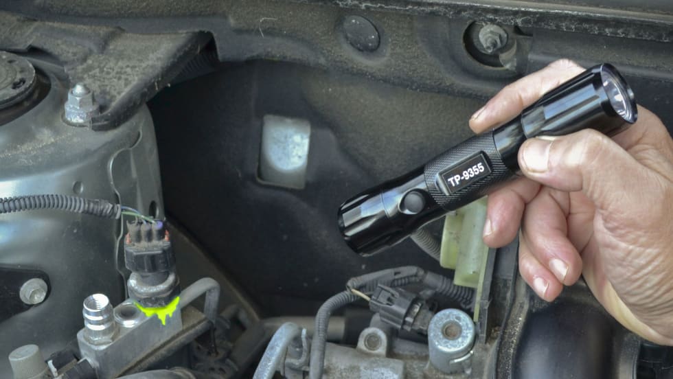 The TP-9355 Dual-Max, a cordless, multi-function, dual-headed LED flashlight, features a high-flux blue light LED on one end for fluorescent leak detection and a high-flux white light LED on the opposite end for general component inspection.