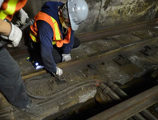 That water courses through tunnel ceilings and walls, ponds on track beds, and is often dammed up behind careless discarded trash. It plays havoc with electrical components, corrodes metal, and lends an overall untidy appearance to station tracks. Transit has already begun an emergency Water Management Initiative where teams are identifying the sources of leaks and then working to seal them with chemical grouting. Additionally, 40,000 street gratings are being thoroughly cleaned to help ensure proper diversion of water.