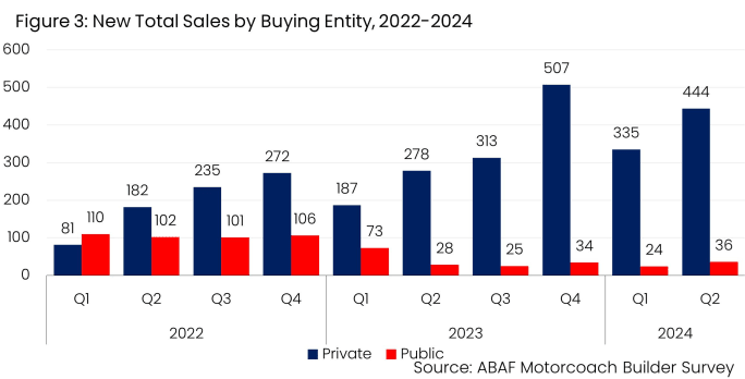 Based on surveys of the major motorcoach manufacturers selling vehicles in the U.S. and Canada, Q2 data for 2024 shows a 37.1% increase compared to the same quarter in 2023, but 27.2% lower than 2019 figures.