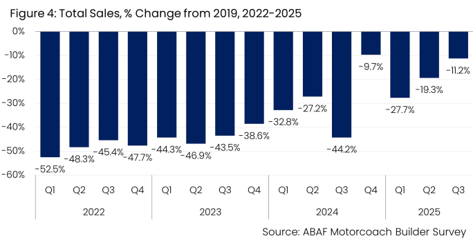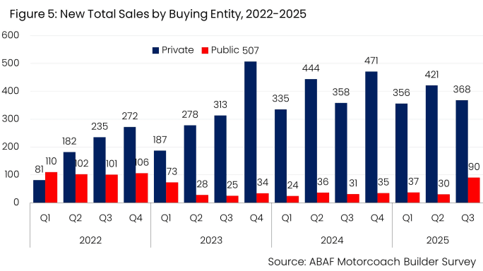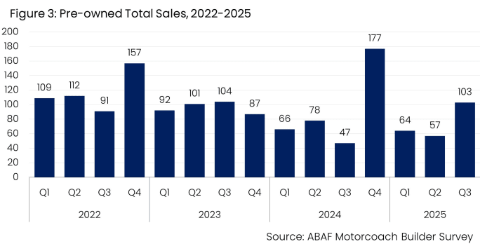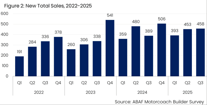 The American Bus Association (ABA) has released its Third Quarter 2025 Motorcoach Builders Survey. Produced quarterly by the ABA Foundation, the report is based on responses from major motorcoach manufacturers selling into the U.S. and Canadian markets.