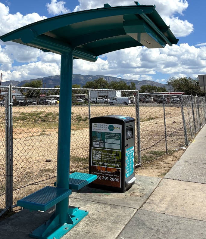 With a vision to improve safety through design, ABQ RIDE leaders charged the organization’s resident welder, William Casias, to conceptualize a new bus shelter model to enhance visibility and discourage loitering while still providing weather protection and comfort. The resulting “thin line” model removes the bench and advertising panels and includes seats, wheelchair access, and shade.