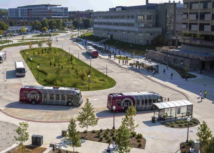 The shelters are part of a multimodal transit facility (Transit Center) improvement project that began construction in 2021 to provide a central transportation hub and alternative transportation facilities.