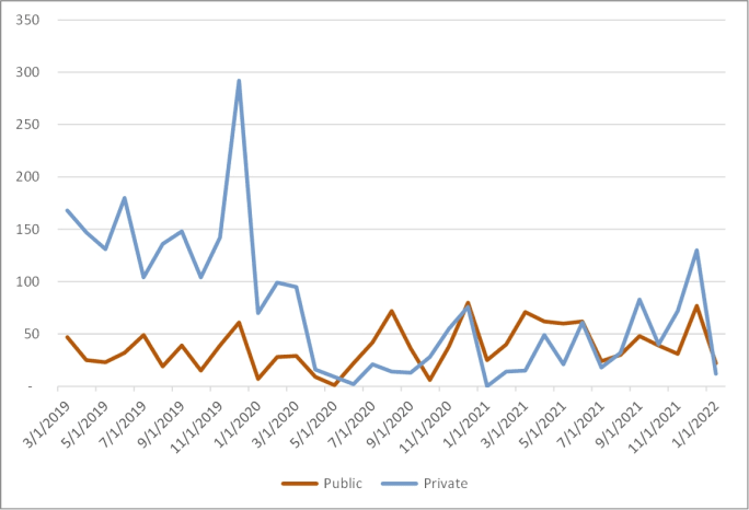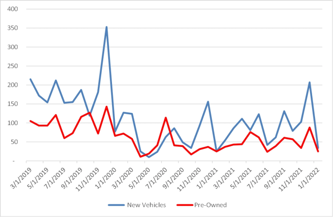 For January, the participating manufacturers sold 34 new and 25 pre-owned coaches, for a total of 59 motorcoaches. This compares with just 50 during January of 2021. The bulk of new coach sales were made to public entities like transit companies, which accounted for 65% of sales. These public entities tended to continue to purchase motorcoaches during the COVID shutdowns, while sales to private companies fell by almost 75% to an average of just 36 per month following the lockdown.
