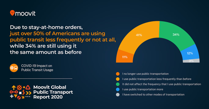 Due to COVID-19 and stay-at-home orders, almost 50% of Americans are using public transit less frequently or not at all, while 34% are still using it the same amount as before.