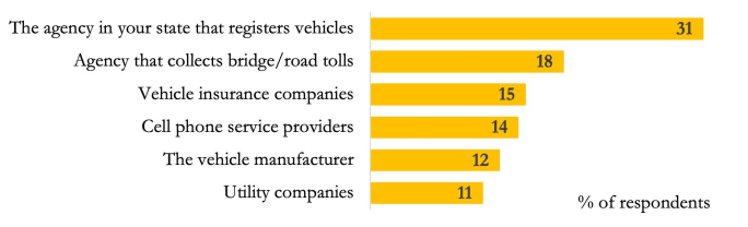 The most popular options among those tested were two government entities: state agencies responsible for vehicle registration or tolling. Fewer people opted for private companies, like vehicle insurance companies or vehicle manufacturers.