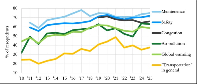 Trends in Support for Raising the Federal Gas Tax Rate to Support Different Types of Improvements (2010 – 2025).