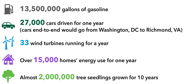 The use of public transit in Northern Virginia reduces 120,000 to 160,000 metric tons of CO2 annually.