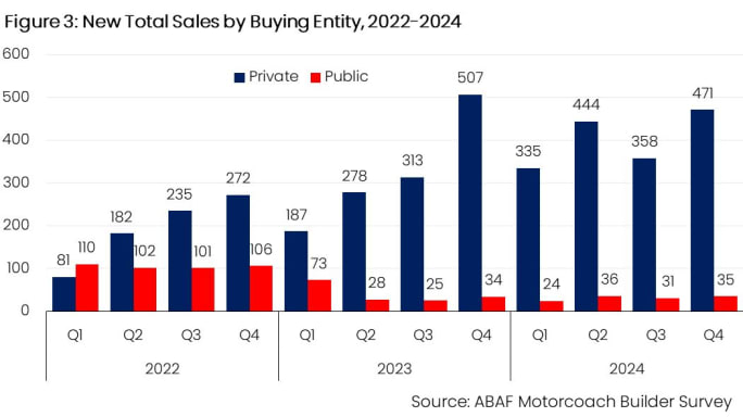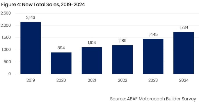 Participating manufacturers sold 506 new and 177 pre-owned coaches, for a total of 683 motorcoaches, according to the Fourth Quarter 2024 Motorcoach Builders Survey, produced by the American Bus Association’s (ABA) research arm, the American Bus Association Foundation (ABAF).