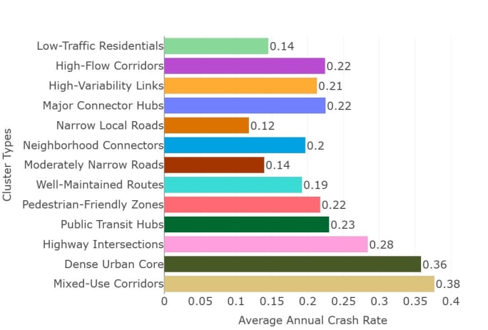 Oke and her team used machine learning-based factor analysis to examine 1,773 such stops, ultimately determining 13 crash-relevant characteristics that cluster into 13 distinct bus stop types ranging from stops on remote rural roads to densely packed urban streets.