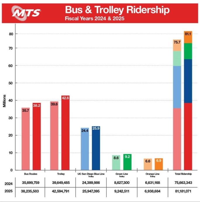 “Surpassing 80 million trips shows that more San Diegans are choosing transit than ever before,” said Stephen Whitburn, MTS board chair. “It’s a testament to the investments we’ve made in reliability, safety, and service quality — and to the dedicated MTS team that works every day to keep our region moving.”