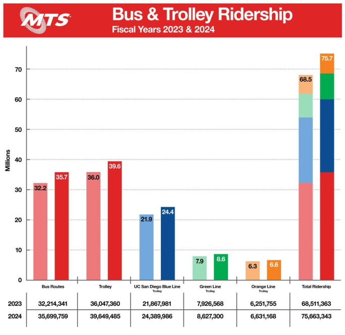 “We believe the increase in ridership is due to a number of factors,” said MTS CEO Sharon Cooney. “People are working from home less often or not at all, MTS provides a reliable alternative to driving a car, and taking transit is much more affordable than driving. With inflation, rising costs of housing, and strained pocketbooks, residents are looking for any way they can to save money. Taking transit is a great way to do that.”