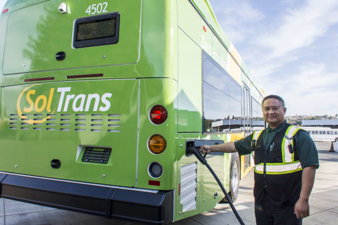 Currently, the transit agency’s fleet consists of 44% non-diesel vehicles; Bay Area Air Quality Management District funded two of the four battery-electric buses, one CNG bus, and 21 diesel-hybrid buses. In addition, it is running two CNG paratransit vehicles, and 16 in its SolanoExpress fleet. SolTrans has four charging stations at its operations and maintenance facility. SolTrans' ridership for the most recent data available was just over 1.4 million one way rides a year.