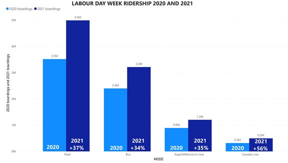 “The early data we are seeing with students now back to in-class learning at the post-secondary level is very encouraging,” said TransLink CEO Kevin Quinn. “I’m optimistic about ridership growth as we move into the fall. We are seeing people eager to get back into routines of work and school and we hope people make transit their first choice in getting to and from their daily activities.”