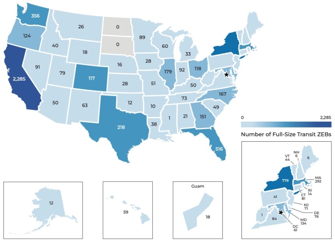 • The adoption of small ZEBs is also expanding, with deployments in public transit fleets increasing by 25%, private fleets by 13%, and university fleets by 121%.