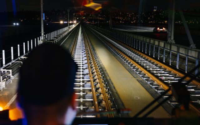 The first Sound Transit Link light rail vehicle crossed the I-90 floating bridge under its own power, enabling the start of a series of tests to prepare for the opening of the full 2 Line in early 2026.