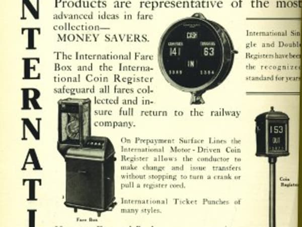 The International Register Co. advertised a fare box, coin register and enamel badges.