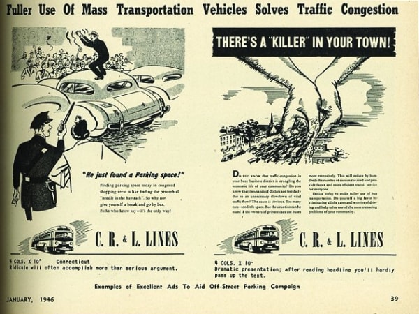 An ad from C. R. & L. Lines describing fuller use of mass transporation vehicles solves traffic congestion.