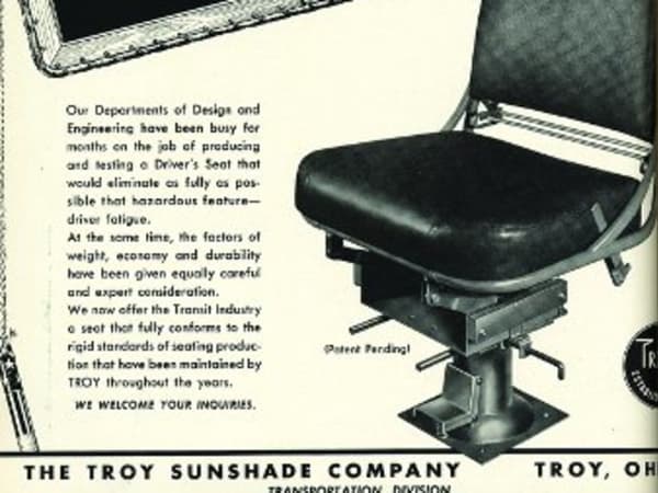 An ad for a new driver seat from The Troy Sunshade Co. which reduces driver fatigue.