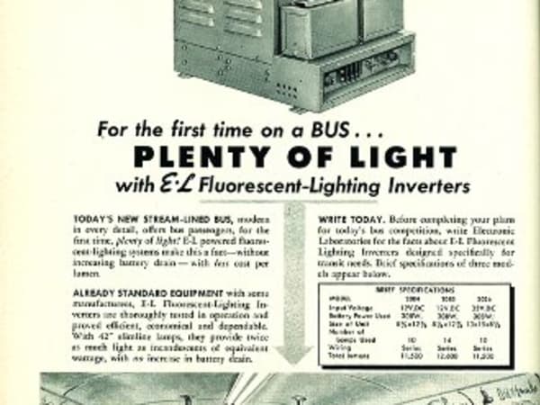 An ad from Electronic Laboratories Inc. describing fluorescent-lighting for the first time on a bus.