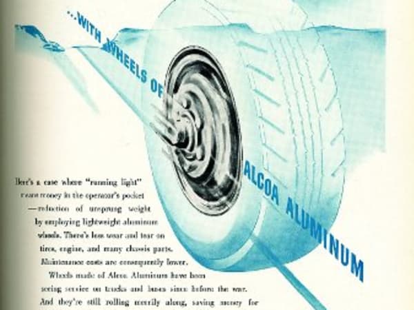 An ad from ALCOA Aluminum Co. describing lower maintenance costs from using lightweight aluminum wheels.