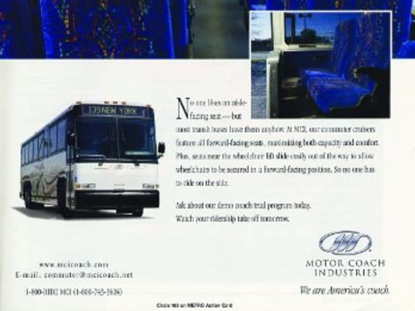 An ad from Motor Coach Industries for commuter cruisers featuring all forward-facing seats.