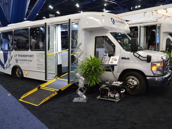 The Champion LF Transport with Flexbus™ technologies is equipped with an electronically controlled air-ride suspension system, Equalizer® Ramp, single-slope entry and a 102-inch-wide true flat-floor passenger area. Features include alternative-fuel options, a large passenger side observation window, 225-amp alternator, five-speed automatic transmission, and a single source for warranty suspension and low-floor conversion.