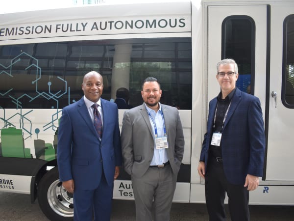 The JTA's Nat Ford Sr., GreenPower's Ryne Shetterly, and Perrone Robotics' Paul Perrone in front of the JTA's autonomous vehicle.