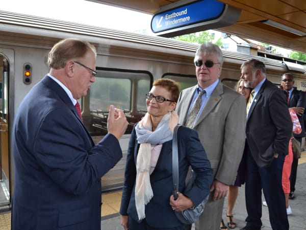 GCRTA CEO Joe Calabrese talks with FTA Acting Administrator Therese McMillan, during a tour of the new Cedar-University Rapid Station on Aug. 28. The tour, led by Joseph Shaffer (right), RTA's director, engineering and project development, came just before the ribbon-cutting ceremony.