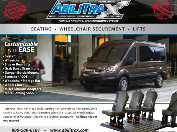 AbiliTrax is a common platform that integrates quick disconnect Step N Lock/Camlock seating with several different wheelchair tie-down options, wheelchair lifts, grab handles, stretcher mounts and several other accessories using a floor grid system. The platform allows users to change the configuration of a vehicle in seconds. Benefits include the ability to own fewer vehicles, a lower cost of operation and a higher resale value, according to the company.