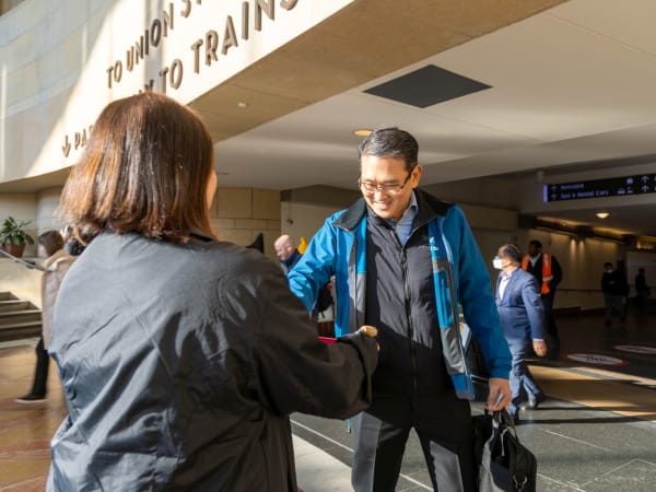 Metrolink board, local elected officials, and staff — donned in branded beanies — extended warm greetings to customers at stations on each of Metrolink’s seven service lines.