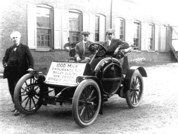 In 1909, after eight years of research and more than $1 million spent, Thomas Edison completes a storage battery for use in electric streetcars and railways. The concept for Edison's battery, which uses an alkaline solution in place of an acid, is still used today in many transit applications. In the same year, Edison also predicts that overhead trolley systems will never be an effective means of transportation.
