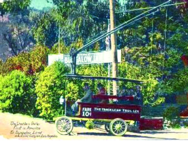 In 1910, Revenue service begins on the nation's first trackless trolley bus line in the Los Angeles area. Laurel Canyon Utilities Co. operates the Bungalow-town Line in Hollywood, which at the time is not in the L.A. city limits. Largely unsuccessful, the line lasts only five years, but it serves as the nation's first experiment with trackless trolley technology during an era of interurban and streetcar preeminence.