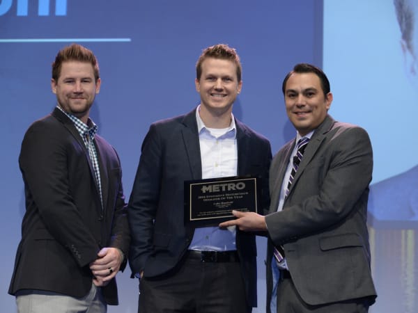 METRO Magazine's Alex Roman (right) presented Luke Busskohl (center) and Brandon Osborn of Arrow Stage Lines with the 2016 Innovative Motorcoach Operator of the Year Award.