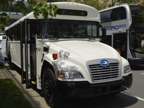 Blue Bird Commercial Buses showcased this front-engine bus featuring a Ford engine and ROUSH Clean Tech propane autogas system. The company's Commercial line all feature an ergonomic driver's cockpit, overhead parcel racks and advanced seating options. Also offered in gas and diesel, Blue Bird will offer a CNG version of this vehicle in the very near future.