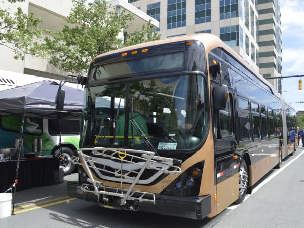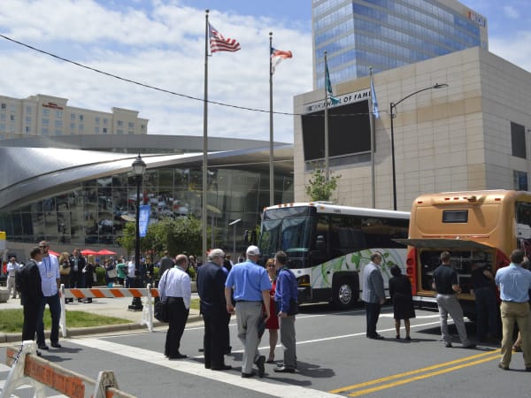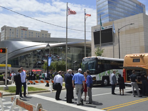 A variety of vehicles were featuring during the 2016 APTA Bus & Paratransit Conference bus display held this year in front of Charlotte, N.C.'s NASCAR Hall of Fame on May 16, 2016.