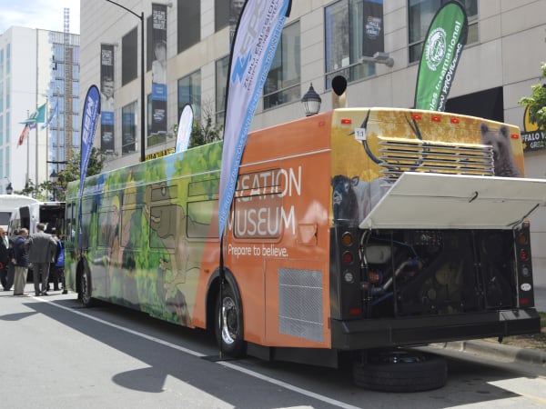 This wrapped Complete Coach Works bus has been remanufactured using the company's Zero-Emission Propulsion System (ZEPS). Using an advanced Lithium-Ion battery system and liquid-cooled drive system, the ZEPS electric bus provides significant fuel and maintenance cost savings, providing a driving range of 150-plus miles per charge.