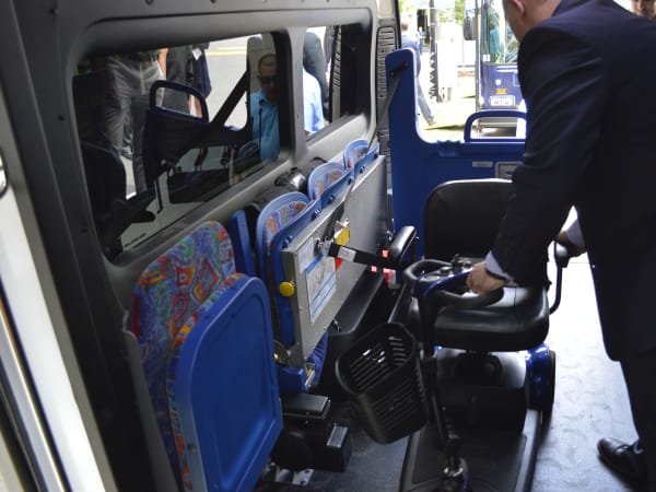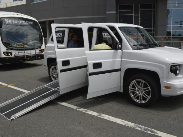 The purpose-built MV-1 meets or exceeds ADA guidelines and features a 36-inch by 56-inch doorway with a low step-in that allows easy entry for all passengers. The vehicle has seating for up to five passengers, with the optional rear-facing jump seat and is FMVSS-certified to meet all applicable safety and crash requirements.