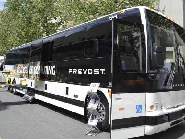 The X3-45 Commuter Coach pairs a Volvo D13 435-horsepower engine to an Allison six-speed automatic transmission and has a standard seating capacity of 57. It also features an expansive entrance with convenient full-length, soft-touch handrails, while the front-kneeling suspension lowers the coach to help passengers getting on or off, meaning greater accessibility even for people with reduced mobility.